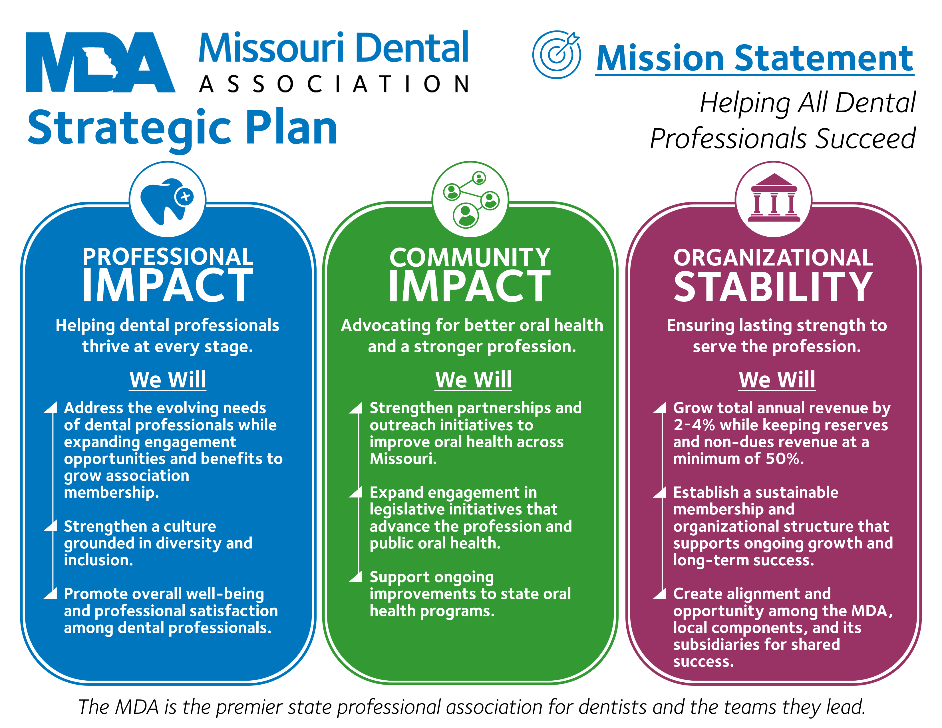The MDA Board of Trustees has 16 members and meets quarterly. It consists of an Executive Committee (President, President-Elect/Secretary, Treasurer, Immediate Past President), eight component society Trustees and a New Dentist Representative, all with voting privileges. Also on the Board are three ex-officio members (without voting privileges), including the Legislative and Regulatory Committee (LRC) Chair, Editor and Speaker of the House of Delegates.
